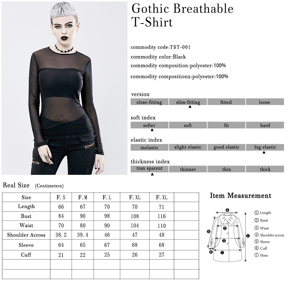 This is the newly launched punk see-through long-sleeved black T-shirt. This T-shirt perfectly combines rebellion and sexiness. The unique see-through design shows your personality charm without losing the sense of mystery. The black tone highlights the low-key luxury, and the long-sleeved style adds a touch of elegance and coolness to you. Wear it and become a street fashion expert, leading the new trend. If you like it, buy it quickly! !